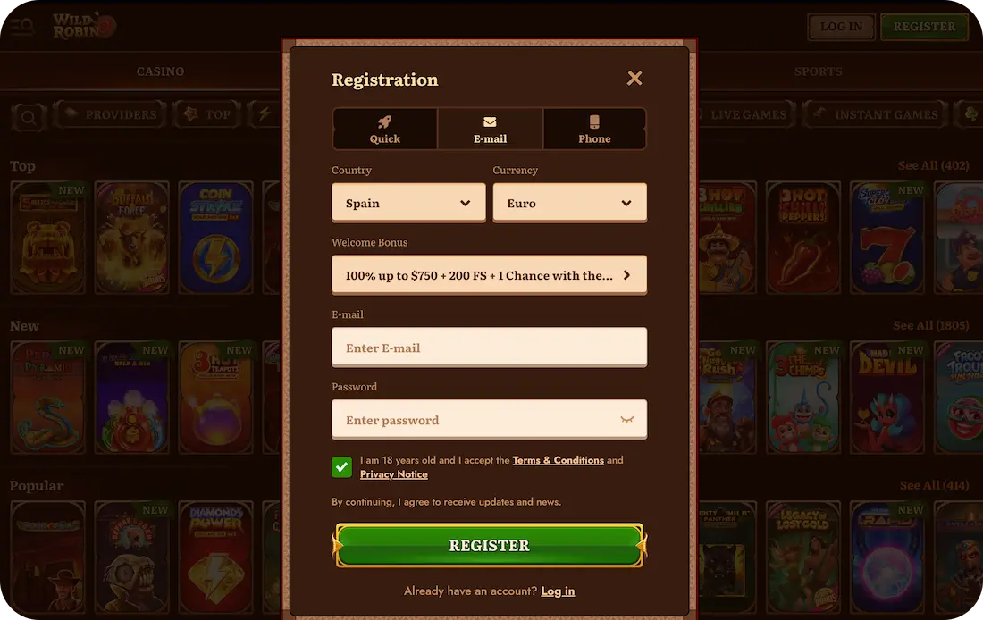 Account creation and further Wild Robin Casino login are easy actions that everyone can do. You need to: