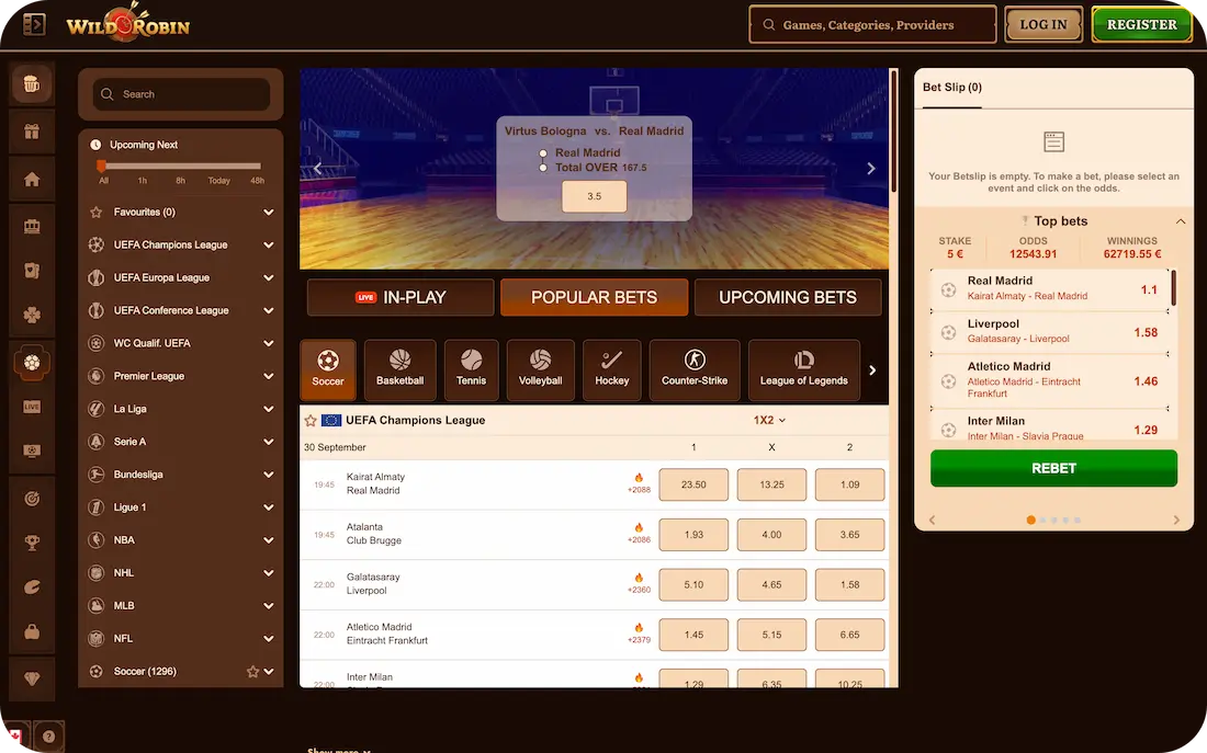 WildRobin players can bet on a wide variety of sports, including popular options like football, basketball, ice hockey, tennis, and 25 others. With events ranging from local leagues to international tournaments, there's something for every sports fan.
