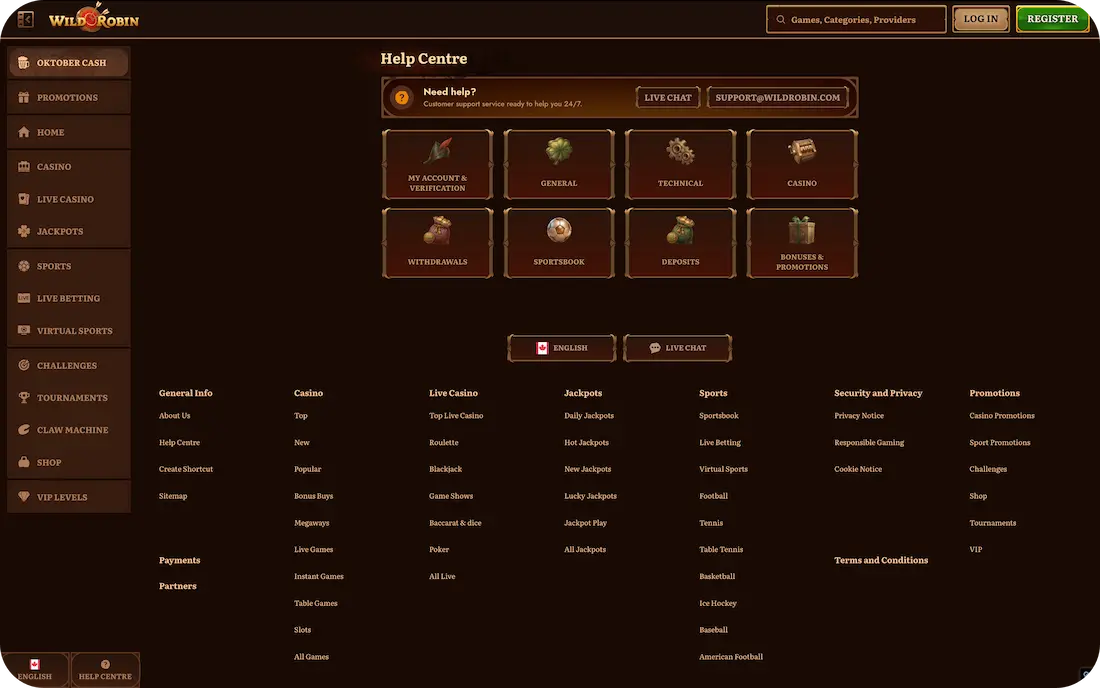 A top level customer care is something that Wild Robin Casino is prod of. The support is given through various communication channels, including live chat and email. The team is available 24/7 through live chat, providing quick response times to inquiries and resolving issues efficiently. Supported multiple languages include English, French and 10+ others. While live chat is the most immediate method, email support ensures thorough assistance for more complex inquiries.